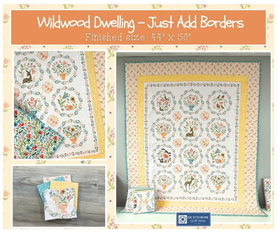 Just Add Borders is made using Wildwood Dwelling by Poppie Cotton. The kits include fabrics to make the quilt top, binding and the pattern. Backing is not included. The finished quilt measures 44"x50".
